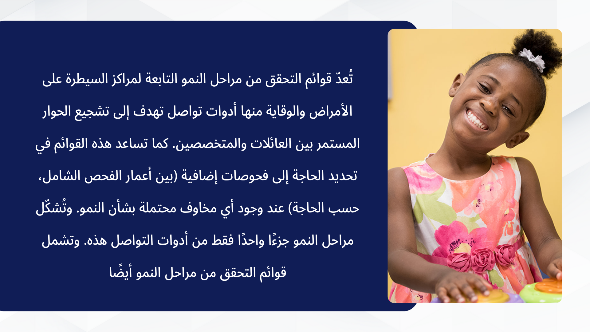 إنّ مراحل النمو المذكورة في قوائم مراجعة مراحل النمو الصادرة عن مراكز السيطرة على الأمراض والوقاية منها ليست إرشادات أو معايير نمائية لنمو الأطفال. ولا ينبغي استخدامها كأدوات فحص أو تشخيص للكشف عن تأخر النمو. في حال وجود أي مخاوف نمائية، فإنّ الخطوات التالية هي الفحص والتقييم باستخدام أدوات رسمية أو الإحالة إلى الخدمات المختصة.